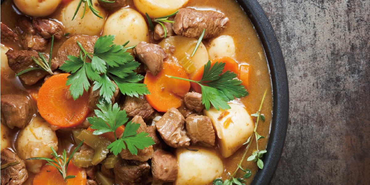 - 牛肉塊用少許高湯抓醃30分鐘、洋蔥切末、馬鈴薯及紅蘿蔔切塊備用