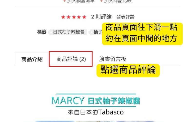 商品頁面往下滑,至如下圖的地方>點選商品評論